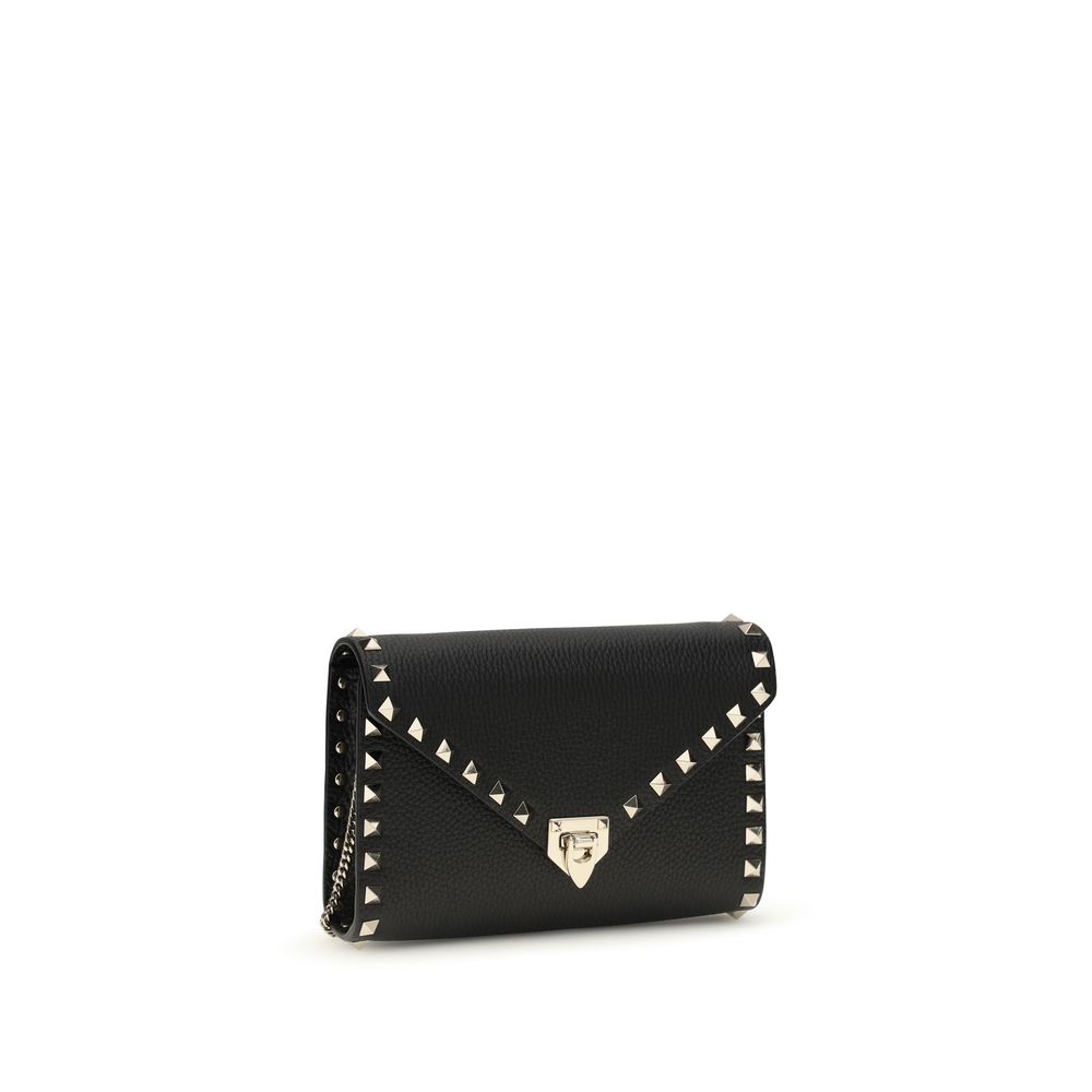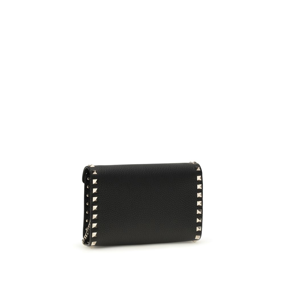 The mini Rockstud Shoulder Bag by Valentino Garavani is crafted from garnet calfskin and embellished with studs and metal details with a platinum finish. Featuring a hook closure and chain shoulder strap, it combines iconic style and functionality in a compact and refined format.
